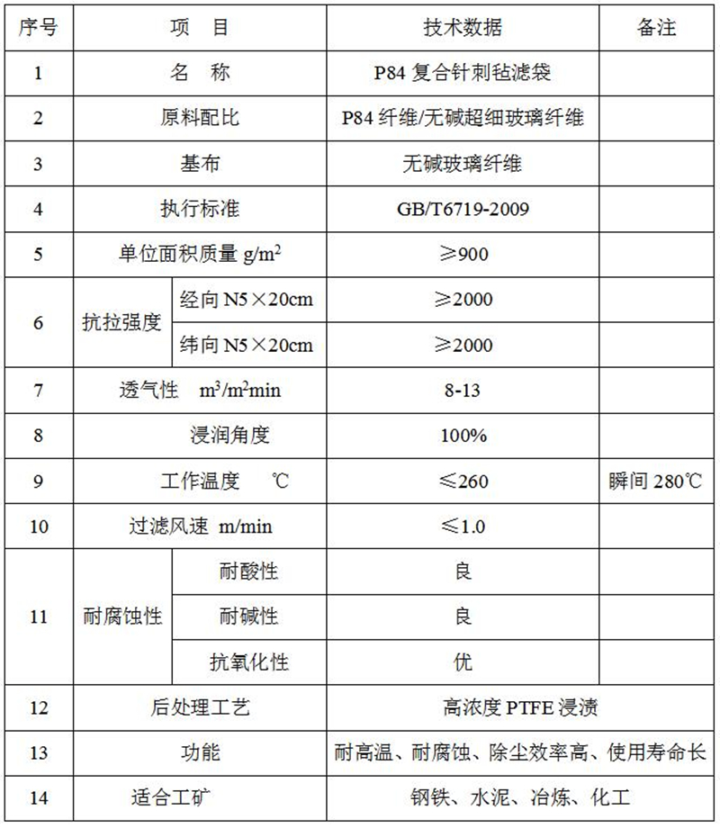 P84复合针刺毡是我公司采用P84纤维、改性玻璃纤维、超细玻璃纤维、等等纤维根据不同工矿需求,而进行不同纤维比例复合而成的一款滤袋,正长的烟气使用温度应≤260℃,P84复合针刺毡有较高的耐温性能,,且有良好的抗化学性,对附带酸碱性质的含尘气体有非常显著的过滤效果,在垃圾焚烧、化工、冶炼、钢铁、水泥等行业中过滤效率尤为显著。