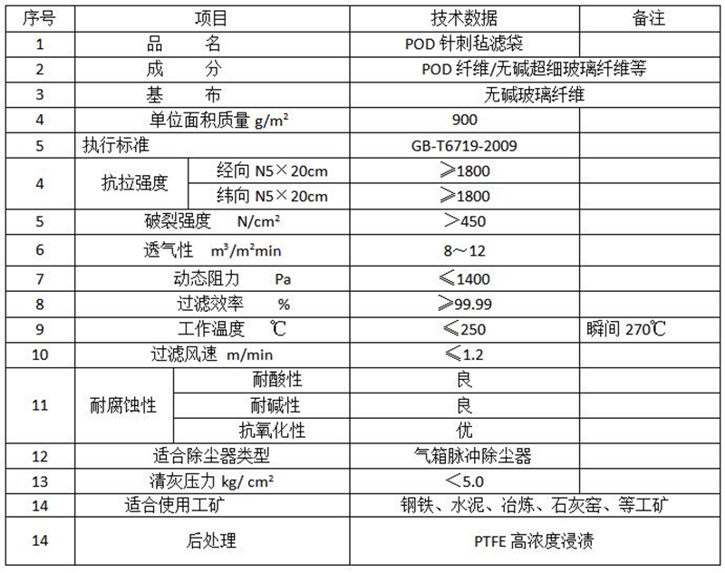 POD复合针刺毡滤袋是我公司在氟美斯复合针刺毡滤袋的基础上研发的一款新产品,它的特点耐高温、耐腐蚀、耐磨损、易清灰、过滤精度高、使用寿命长,适用于钢铁、水泥、化工、冶炼等工矿使用。